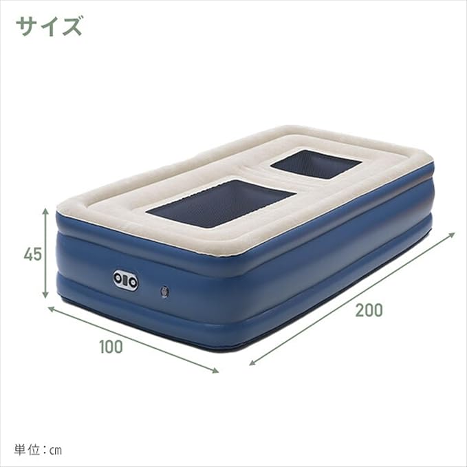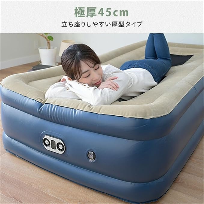 ●【約150秒で空気注入完了】ボタン一つで簡単・すぐに空気の注入・排出ができるエアーベッドです。キャンプや車中泊、防災対策、来客用にオススメです。厚みが約45cmあり底付き感なく使え、立ち座りもしやすい高さなので簡易ソファとしてもお使いいただけます。