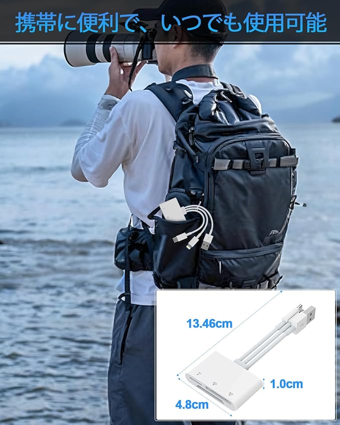 【幅広い対応性】本iphone sdカードリーダーは、SDカード(SD / SDHC / SDXC、最大2TBまで)、microSDカード(microSD / microSDHC / microSDXC、最大1TBまで)、そしてxDピクチャーカード(Type M / Type H、最大2GBまで、オリンパス・富士フイルム製を含む)に対応した多機能カードリーダーです。Lightning、USB Type-C、USB Type-Aの3種類の端子を搭載しており、iPhoneやiPad、MacBook、Windows PC、Androidスマートフォンなど幅広いデバイスでご利用いただけます。ドライバ不要のプラグ&プレイ設計で、写真や動画、ビジネスデータの転送をスムーズかつ安定して行える、安心・信頼の一台です。
