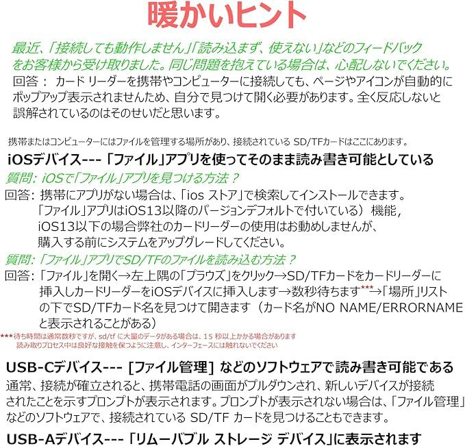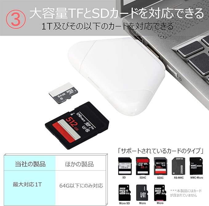 大容量メモリカードを対応できる ---- 容量1T及びその以下のMicro SDとSDカードを対応できる、さまざまな形式のカードの読み取りと書き込みをサポートします。大容量ファイルデータの転送にとって、転送速度が一番重要である。iOS機器場合の転送でも、25MB/Sに達することができます(一般製品のスピードは14 m/sしかないです)