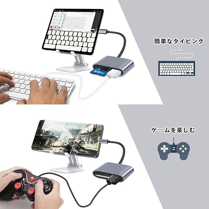 【TypeC 3in1SDカードリーダー】Type Cデバイスに適用するUSB3.0 SDカードリーダー。この3 in 1 タイプC SDカードリーダーは1つのSDカードポート、1つのMicro SDカードポート、1つのUSB3.0(500mA)ポートをサポートしています。TF/SDカード512GBまでごサポート。対応SDXC/SDHC/MMC/SD/Micro SD/Micro SDXC/Micro SDHC/TF等カード2枚同時読み書き可能。デュアルカード双方向同時読み書き可能。