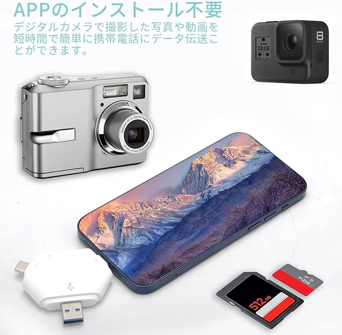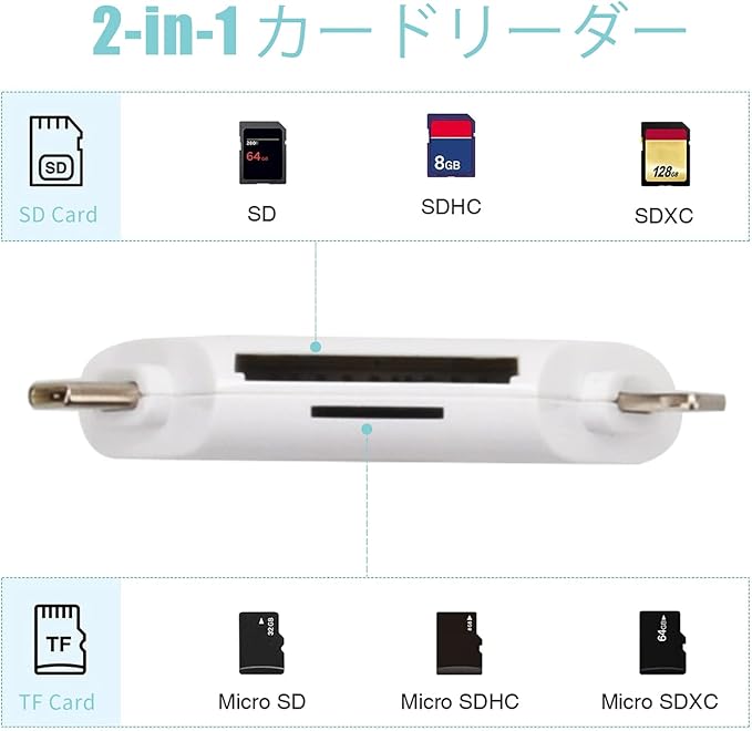 【プラグ&プレイ】本製品は、デバイスドライバや余計なアプリを頼らなくて、直接に挿入するだけですぐに使用できます。iOS・iPadOSのユーザーは「ファイル」APPを使えれば、データを読取できます。本製品を使えば、本製品の適用デバイスはいつでもどこでもTF・ SDカードのデータを読み取ることができます。