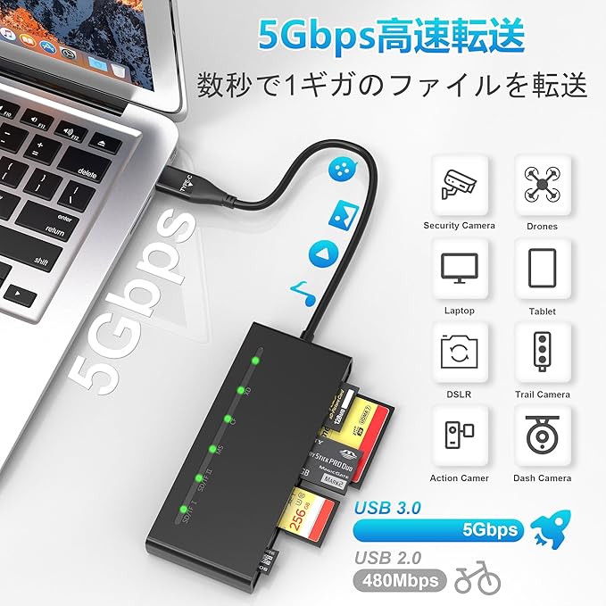 ✅【5Gbps超高速データ転送】CFカード アダプターは5Gbp/sの超高速データ転送速度を持ち、USB2.0(480Mbps)の10倍で、USB2.0/1.1と下位互換性があります。 HD映画、画像や動画をカードからコンピュータに速く、効率的に転送して、時間を大幅に節約します。