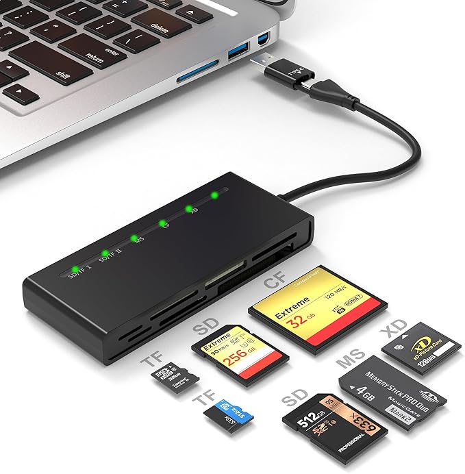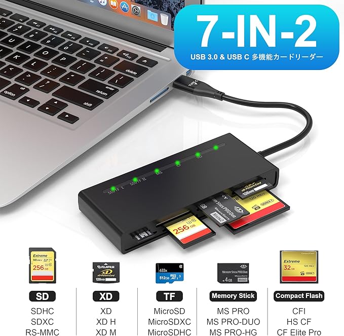USBA/USB C SDカードリーダー、7 in 2 マルチカードリーダー SD/Micro SD/CF/XD/MS/MMCカメラメモリカード用XDピクチャーカード リーダー、5Gbpsで5枚同時読み込み可能メモリーカードリーダー