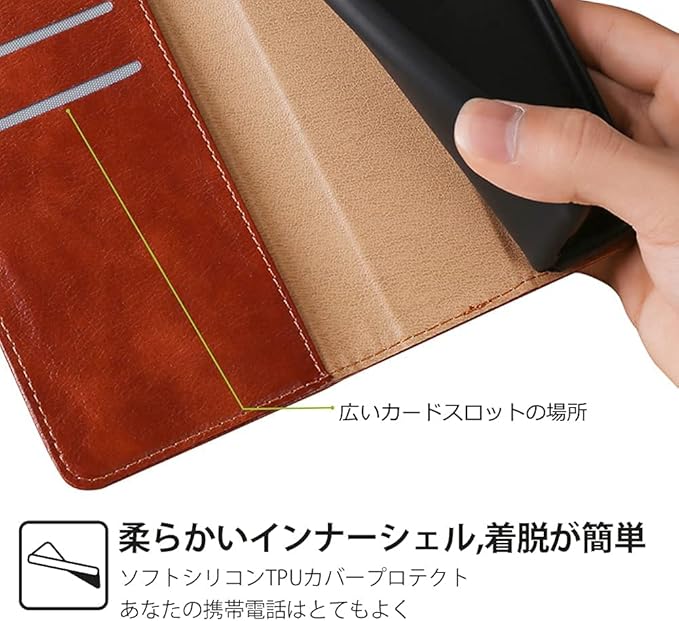 【上質な素材】高品質のPUレザーを採用し、手触りが良く、放熱性も抜群。柔らかいTPUバンパーは取り付け・取り外しが簡単で、スマホ本体への損傷も心配いりません。しっかりとした保護性能を備えています。毎日見るものだから、飽きのこないシンプルデザインを持つ。