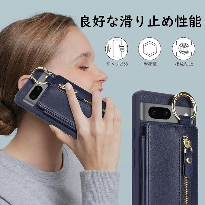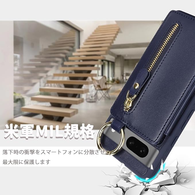 Havaya 対応 Pixel 7a ケース ピクセル7a ケース カード収納 米軍MIL規格 リング付き キーホルダー キーリング Google 耐衝撃 au docomo スタンド機能 SoftBank 財布 フェイクレザー-ブルー