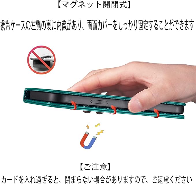【カードポケット付き】:財布型ケースとして、名刺やお札などを入れるカードポケットがつき、ちょっとしたお出かけにもスマホケース一つでOK!日常生活に便利です。ただし、カードを入れ過ぎると、閉まらない場合がありますので、ご遠慮ください。