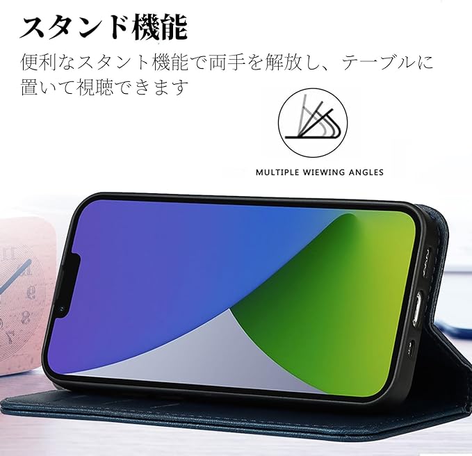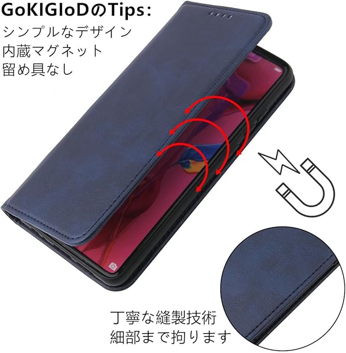 【機能性②】:マグネット内蔵ので、磁気閉鎖機能を持ちます。精密な縫製技術を重ねて出来上がったのは、この手帳型ケースです。二重カバーのデザインにより、大切な携帯をキズ、汚れ、衝撃からしっかりと保護できます。