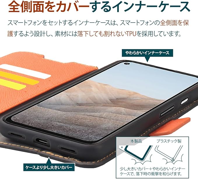 【全側面カバー】… インナーケースはデバイスの全側面を保護できるように設計しており、落下しても割れないTPU素材を使用しております。フリップ内側には、カードホルダーが装備されており、ICカードやクレジットカードや紙幣等を収納できます。