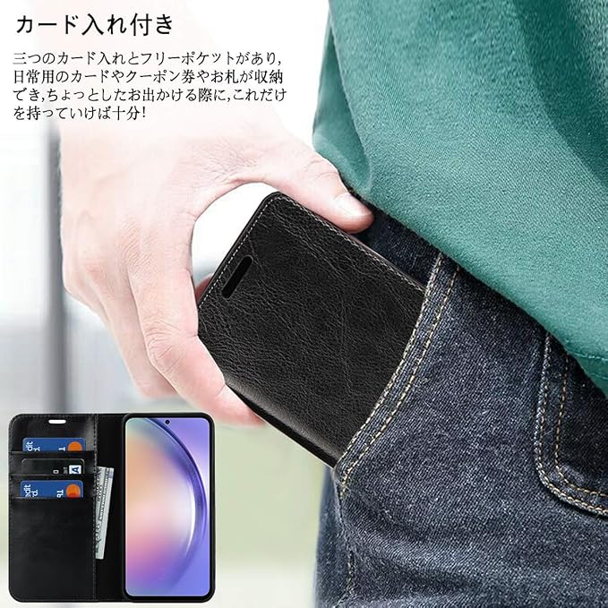 【機能性①】:シンプルでシックなデザインで、場所問わず長くご愛用いただける手帳型です。丈夫で、汚れ防止と摩擦耐性を持つスマホケースです。