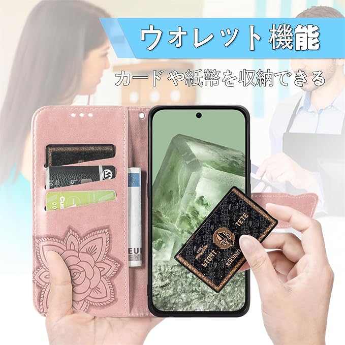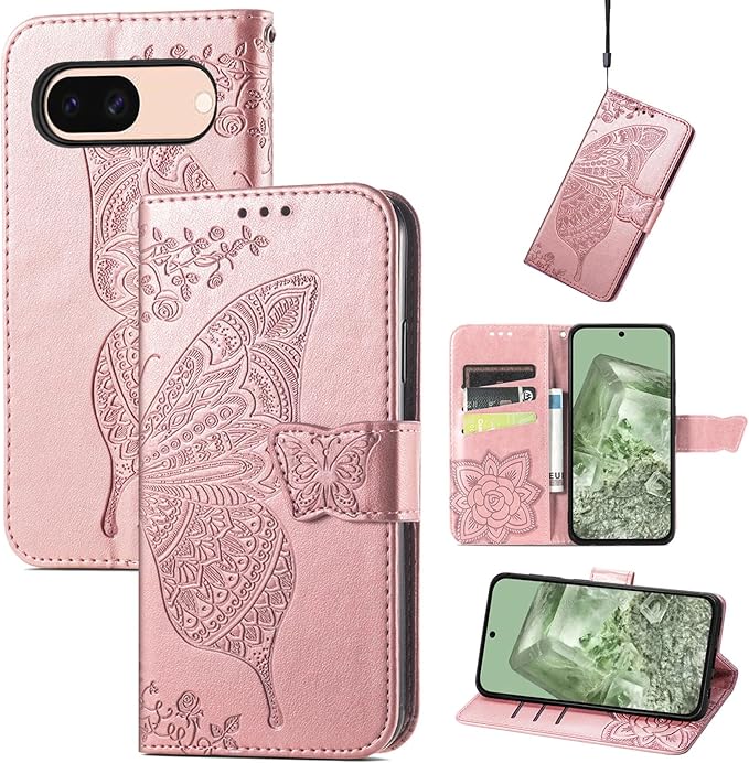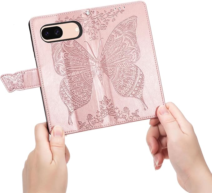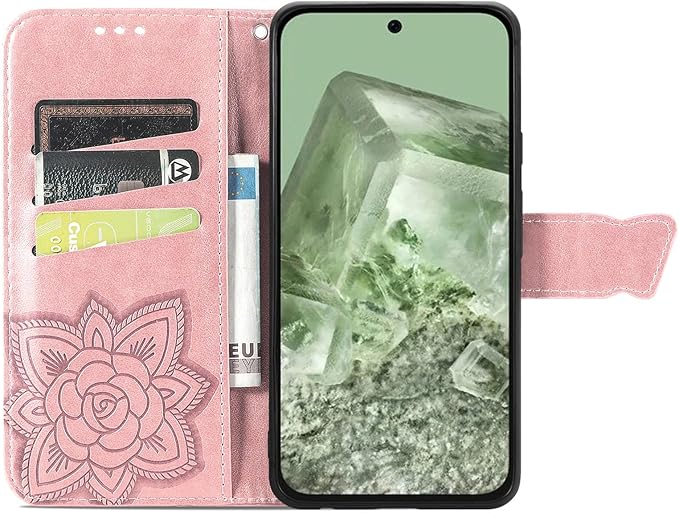Pixel 8Aケース 手帳型 ローズゴールド グーグル ピクセル8A ケース 財布型 カード収納 かわいい 蝶々 フラワー柄 シンプル おしゃれ ドコモ Pixel 8A 手帳型ケース 良質 革 レザー マグネット式 ピクセル8A 携帯ケース 横置きスタンド機能付きPixel 8A スマートフォンケース 耐衝撃 ストラップホール付 画面保護