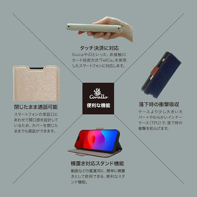 スタンド機能、閉じたまま通話可能、邪魔になりにくい留め具など、使い勝手の良さを追求した設計です。