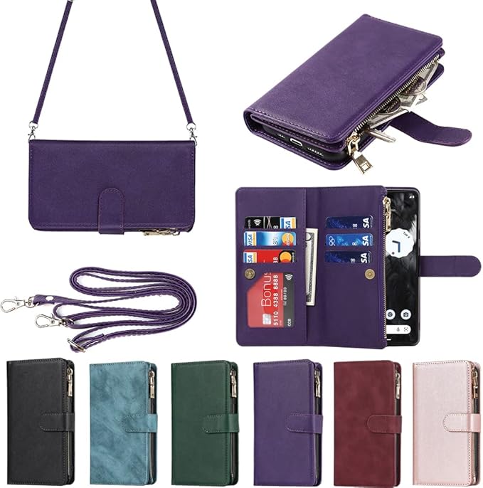 for Google Pixel 7A ケース for pixel 7a google 縄掛けケース Pixle7A 手帳型 財布型 ICカード コインポケット ストラップ付き カード 収納 小銭入れ ファスナーポケット付き PUレザー 6色パープル