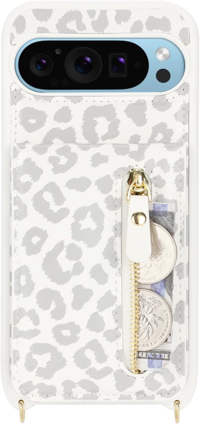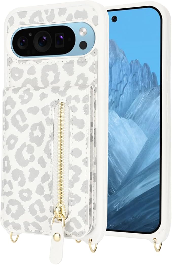 Google Pixel 9 Pro XL ケース ショルダー ストラップ付き ショルダーケース 背面フリップ 上下開 手帳型 Google用 pixel9proXL docomo au SIMフリー softbank 全対応 グーグル ピクセル9プロXL カバー case 適用 iCoverCase カード収納 縦置き スタンド 肩がけ 首掛け 斜め掛け 携帯カバー 豹柄 ヒョウ柄 ホワイト