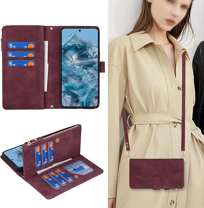 for Google Pixel 8 Pro ケース for pixel 8pro 縄掛けケース for Google Pixel8 Pro 手帳型 財布型 ICカード コインポケット ストラップ付き カード 収納 小銭入れ ファスナーポケット付き PUレザー 6色 レッド