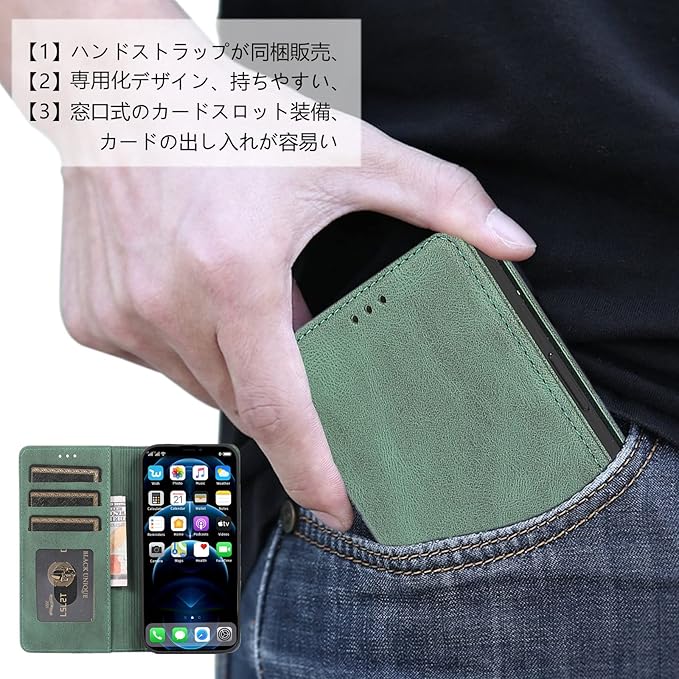 【ポイント②】:マグネット内蔵式のケースです、留め具なしでシンプルなデザイン感をよりアップさせます。表面は手触りの良い合成レザーです、内部の柔軟なTPUホルダーは衝撃吸収の性能が抜群で、万が一の落下した時、大切なスマホ本体をしっかり守ることができます。