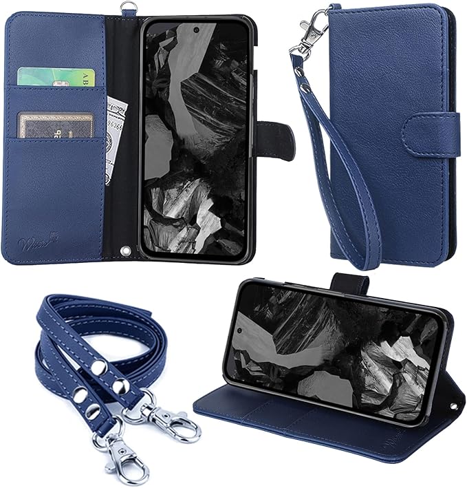 wisers Google Pixel 8a ケース 手帳型 スマホケース 対応 (ダークブルー) (カードホルダー/スタンド機能付き) ストラップ 2種付き (ハンドストラップ/ネックストラップ) 2024年 新型