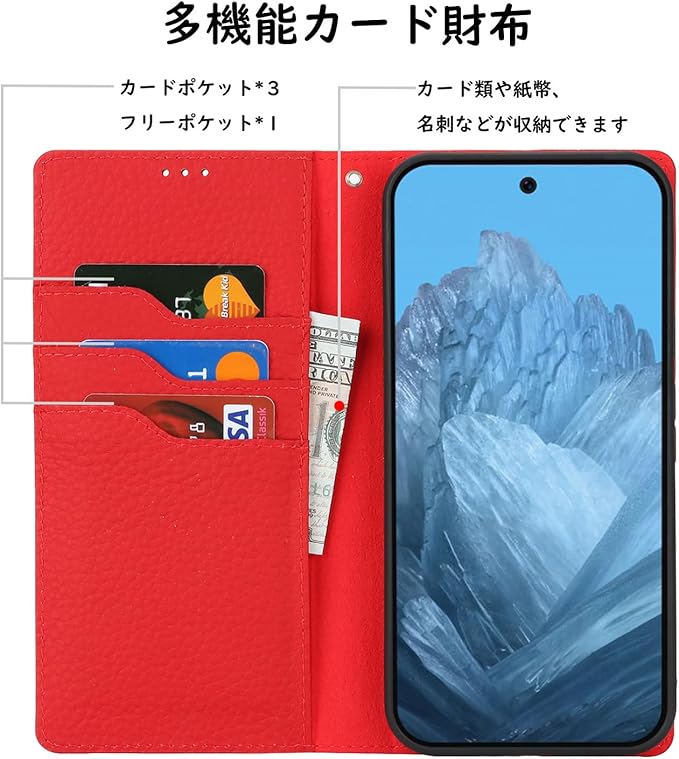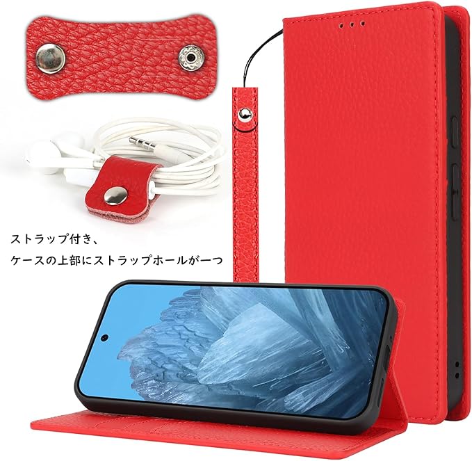Havaya 対応 Pixel9 pro ケース Pixel9 ケース ピクセル9 ケース 手帳型 本革 ストラップ Google グーグル スマホケース docomo au 耐衝撃 カバー SoftBank カード収納 スタンド機能 レザー -レッド