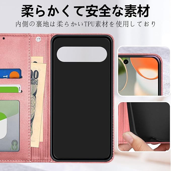 スタンド機能:Google pixel 9 、google pixel 9Pro 手帳型ケースはスタンド機能が付き、横向いて斜めに立てて、お好きな角度を調整でき(150 以内)、両手が解放され、お気軽に読書やビデオの観賞を楽しむことができます