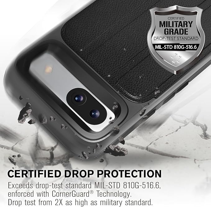 [CORNERGUARD テクノロジーによる軍用グレードの落下保護] CORNERGUARD 設計を採用した二層ポリカーボネートと TPU は、軍用落下試験基準 (MIL STD 810G-516.6) を超え、8フィートの高さから26 回の落下に耐えます。