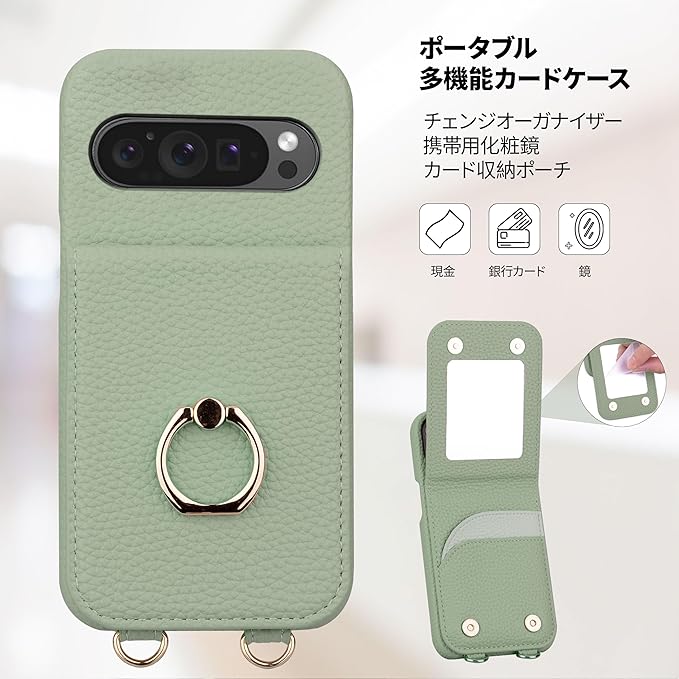 For Google Pixel 9/9 Pro ケース 手帳型 グーグルピクセル9 ケース ショルダー Google Pixel 9 カバー 手帳型 Googleピクセル9 Pro ケース 肩掛け 斜め掛け(長さ調整可能) 背面カード収納 化粧鏡付き スタンド機能(リング付き) Pixel9 ケース ミラー付き (コンク・グリーン)
