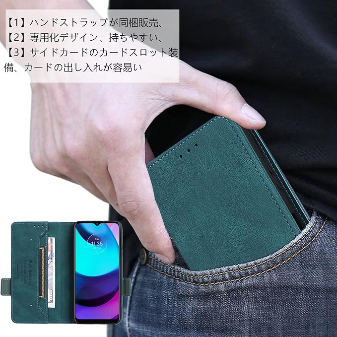 【ポイント②】:ハンドストラップ同梱販売、落下防止機能性が備えます。マグネット内蔵式の留め具でピタッと容易く閉まります。内部の柔軟なTPUホルダーは衝撃吸収の性能が抜群で、万が一の落下発生の時、大切なスマホ本体をしっかり守ることができます。