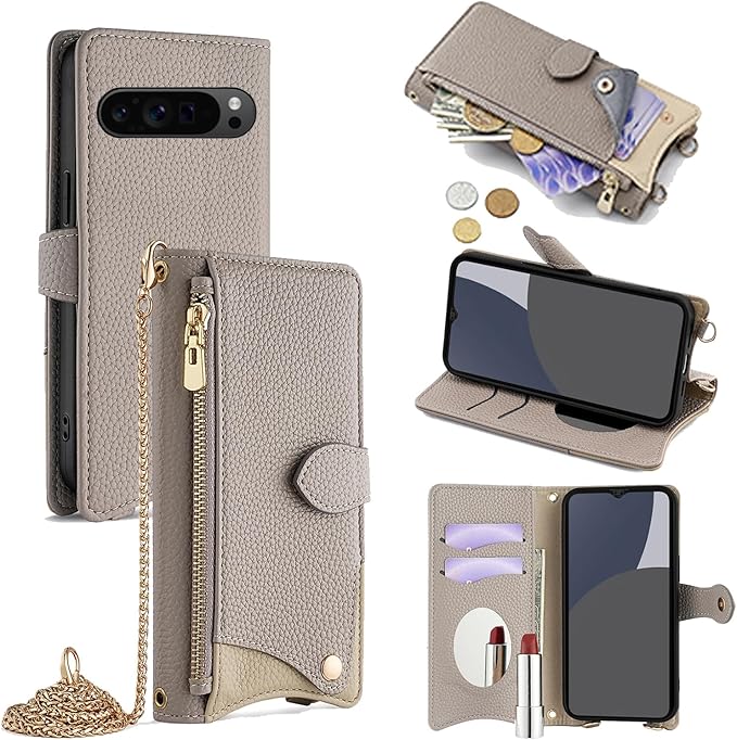 For Google Pixel 9 Pro XL ケース 手帳型 ショルダー For グーグル ピクセル9プロ XL カバー 財布型 肩掛け 横+縦 2掛け方 斜めがけ 化粧鏡付き おしゃれ ジッパー小銭入れ カード収納 横置き ロングストラップ 耐汚れ PUレザー 防指紋 高耐久性 女性用 贈り物 COCOCLOUD グレー