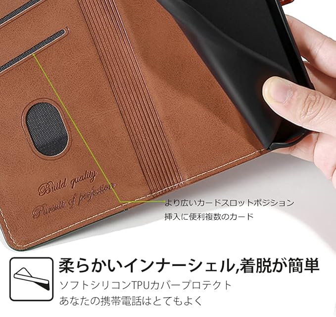 【上質な素材】高品質のPUレザーを採用し、手触りが良く、放熱性も抜群。柔らかいTPUバンパーは取り付け・取り外しが簡単で、スマホ本体への損傷も心配いりません。しっかりとした保護性能を備えています。毎日見るものだから、飽きのこないシンプルデザインを持つ。