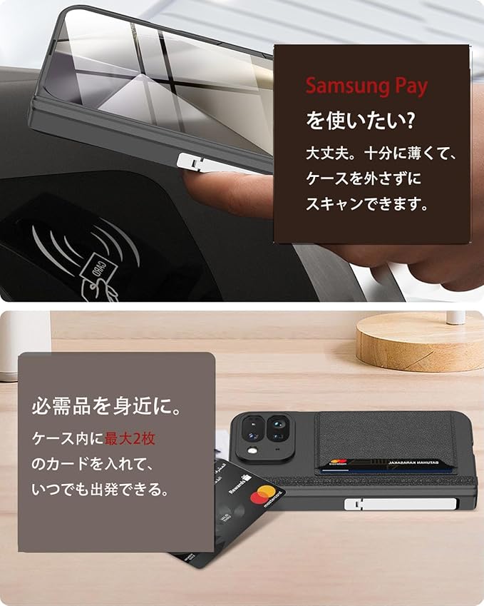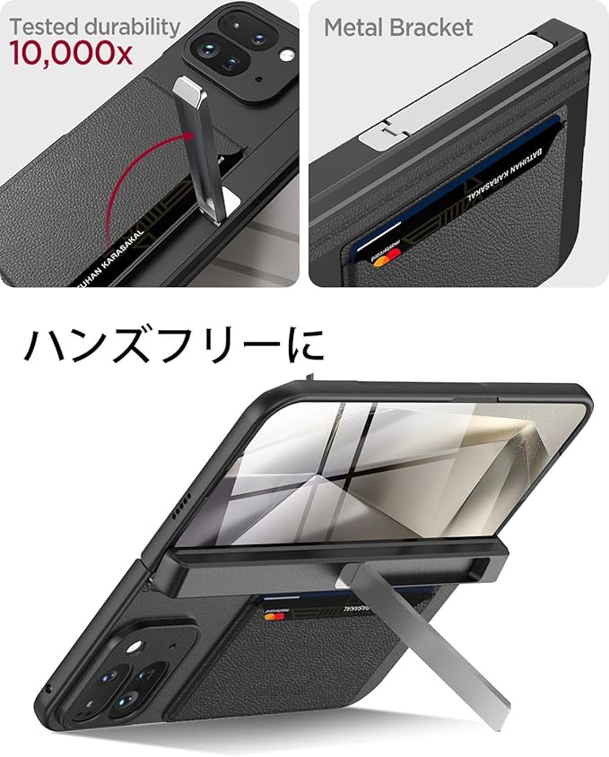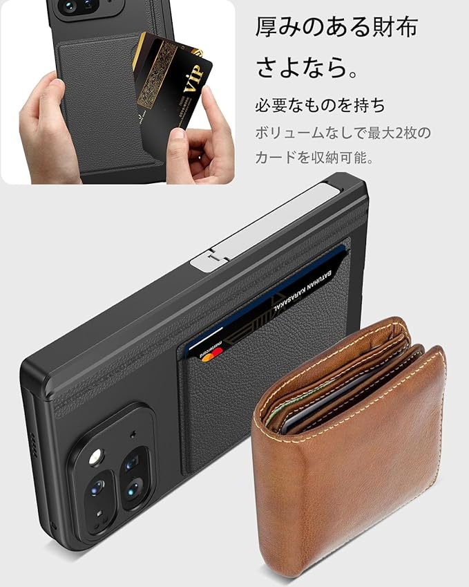 【カード収納&スタンド機能】❶2 つのカードスロットがあり、精密な切り口によりカードを安全に保管できます。ショップでのポイントカード、交通機関でのスムーズな移動をサポートでき、ちょっととしたお出かけてもこれで十分です。❷機能性 横置きスタンド機能が付いて、好きな角度で動画鑑賞や読書などを楽しめます。耐久性テスト1000回を経た金属製ブラケット。あなたの手を解放してくれます。