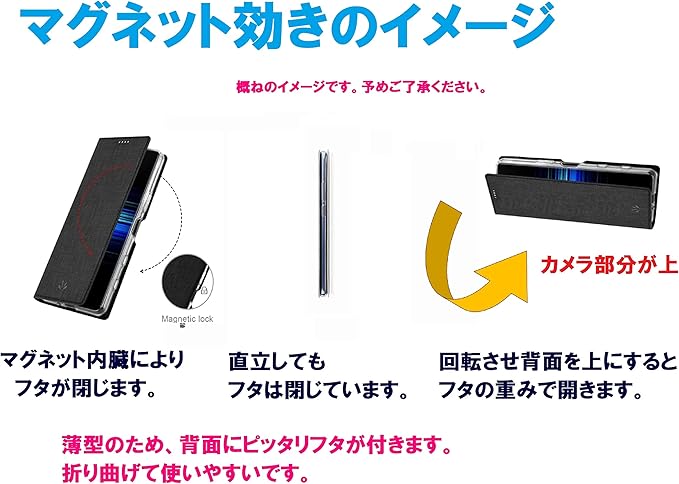 マグネットの効きは弱めです。ケースを傾けるとフタの重みで開く程度の磁力です。(機種本体に貼られた保護ガラス/フィルムや、カード収納の有無によっても異なります。説明画像はカード収納なしのイメージです。
