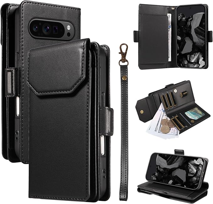 【5色選べる/完全財布代替】Google Pixel 9 Pixel 9 Pro ケース 手帳型 ピクセル 9/9Pro 財布型 大容量11カード収納 側面マグネット式 ストラップ付き スタンド機能付属( Pixel 9 /9 Pro兼用、ブラック)