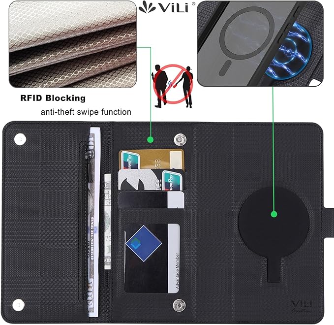 お財布部分とカード収納部分はマグネットでしっかり閉じられるため、スマートフォン操作中にカード等を見られることがありません。