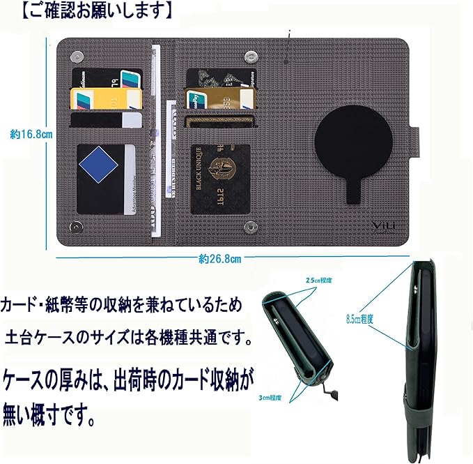 【サイズ】:お財布機能(紙幣)を兼ねているため、土台ケースよりお手持ちの機種サイズが小さい場合がございます。画像による説明を必ずご確認頂けますようお願い申し上げます。