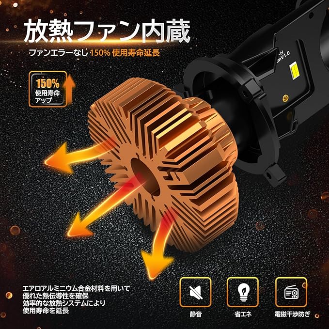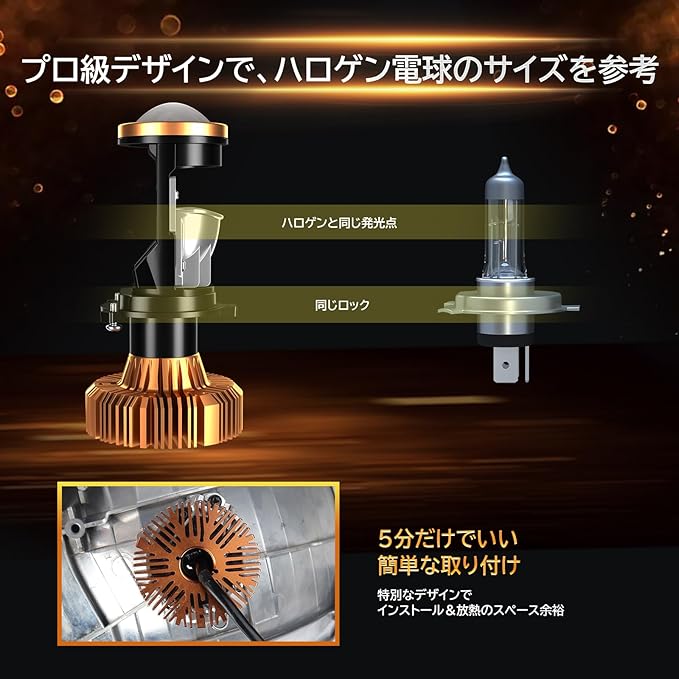 【迅速な放熱】H4プロジェクションLEDヘッドライトは、航空機用アルミニウム全体を使用し、ユニークで中空のヒートシンクを備えており、放熱効率が250%向上し、バルブが50000時間以上連続して点灯することを保証します。最新のミニプロジェクターレンズ付きH4 LEDヘッドライトは、元のハロゲンサイズに完璧に適合し、簡単に取り付けることができます。