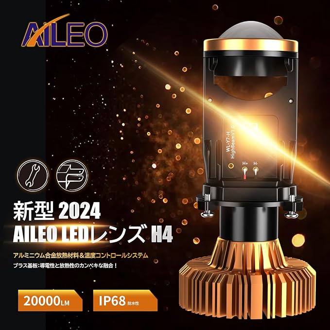 AILEO 2024キットH4 LEDヘッドライト、レフトハンドドライブ用ミニプロジェクターレンズ付き、アップグレード済み、キャンバスエラーフリー、100W 20000LM 6500Kホワイト、H4 9003 HB2 LEDヘッドライト、ハイビーム/ロービーム、2個セット。
