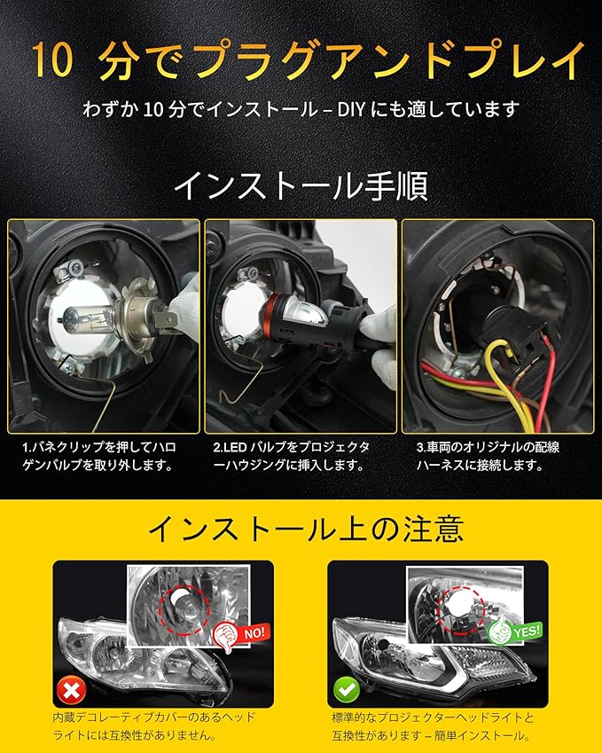簡単プラグ&プレイ取付 純正ハロゲンと同じ1:1サイズ設計。穴あけ・配線・シーリング不要で、純正ハロゲンを外してLEDを差し込み、カプラーを接続するだけ。約10分でDIY交換が可能です。
