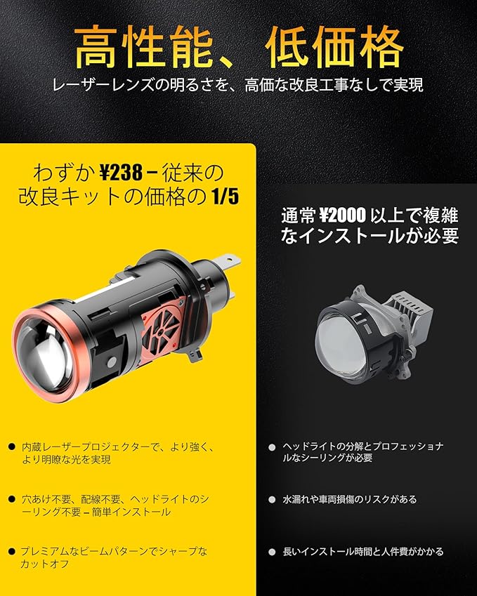 主な仕様光束(ルーメン):1セットあたり20,000LM(1個あたり10,000LM)で、圧倒的な明るさを実現。モデル詳細:AILEO 第1世代 H4 レーザー LED ヘッドライトバルブ。内蔵レーザープロジェクター搭載で、より強くクリアな光を提供。Hi/Lo切替可能で、シャープなカットオフラインとプレミアムビームパターンを実現。右ハンドル車対応。色温度:昼光を模した明るい6000Kホワイト光で視認性向上。材質:航空グレードアルミニウム製ボディ、15,000rpmの高性能ファン搭載で優れた放熱性能。可変ライトソレノイドバルブ、高/低ビームリフレクターカップにより最適な熱拡散を確保。動作電圧:DC 9–16V、12V車両システム対応。寿命:50,000時間以上の長寿命設計で、頻繁な交換の手間を削減。特徴視認性向上:高精細コンデンサーレンズとレーザーチップ(高輝度LEDハイビームチップ + 55ml LEDロービームチップ)を搭載。光を効果的に集中させ、夜間走行も安心。ハロゲンランプ(射程100m)と比較して最大500mの照射距離、1500%明るくなります。簡単取付:プラグ&プレイで約10分のDIY取付が可能。穴あけや配線、ヘッドライトシールは不要。ハロゲンバルブをスプリングクリップで取り外し、LEDバルブをプロジェクターハウジングに差し込み、車両の純正ハーネスに接続するだけ。※装飾カバー内蔵のヘッドライトには非対応、標準プロジェクターヘッドライトに対応。取付注意取扱注意:取付時は丁寧に扱い、破損を防ぐ。互換性確認:装飾カバー内蔵のヘッドライトなど、車両のヘッドライト仕様と互換性を確認すること。同梱内容H4 レーザー LED ヘッドライトバルブ 2(プロジェクターレンズ付き)