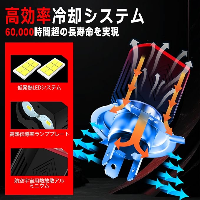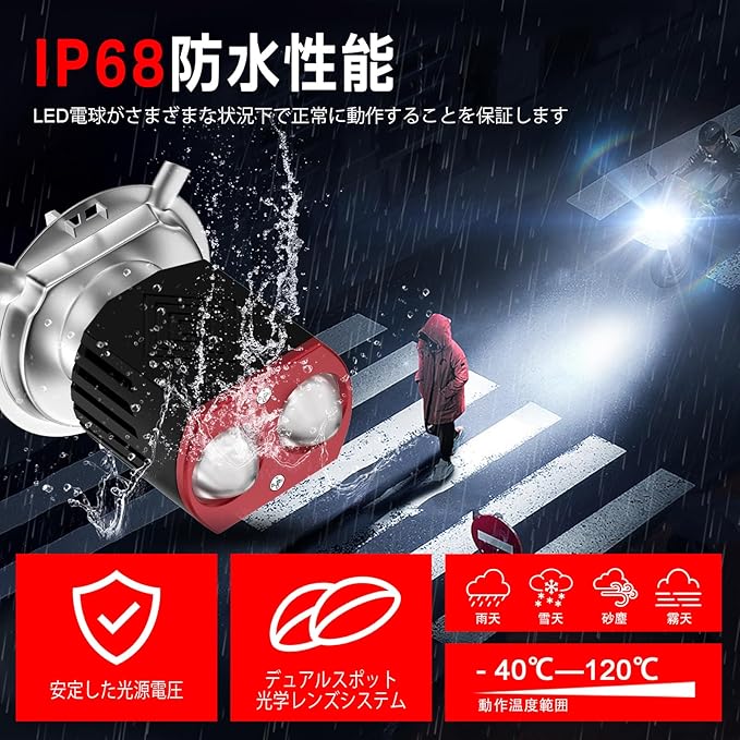 【ハロゲン電球からの完璧なアップグレード】当社のH4 LEDヘッドライトバルブは最大1200LMの明るさを実現し、6000Kキセノンホワイト色調です。上部に6個の高品質カスタム3570チップ、側面に60個の3030チップを搭載し、1個あたり最大25Wの出力で、伝統的なハロゲン電球より3倍明るく、真っ暗な夜をも切り裂くほどの明るさを誇ります。暗部や陰影が一切なく、夜間のバイク運転時により長い照射距離と広い視野を提供します。