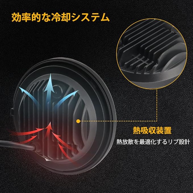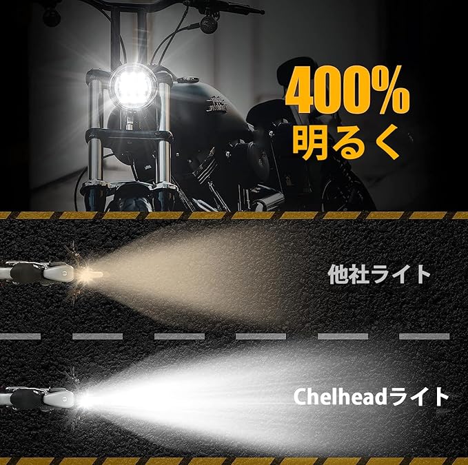 高輝度LED照明:6000Kの白色光で、ロービーム2800ルーメン、ハイビーム4000ルーメンの明るさを実現。最新のリング機能付きで、デイタイム走行灯としても使用可能(赤と黄色のワイヤ接続で簡単設定)。