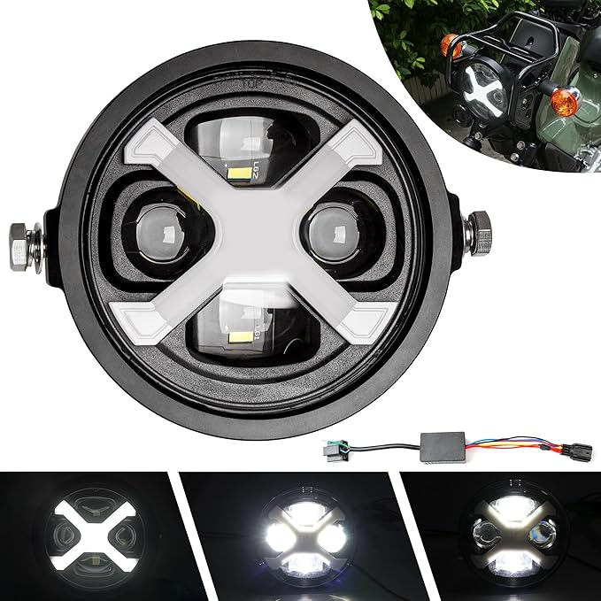 【3つの照明モード】:このクロスカブCC110 ヘッドライト,「X」ホワイトDRLデイライト、ハイビーム、ロービーム。 このLEDヘッドライトは高輝度LEDを使用し、6500LMハイビームと5500LMロービームの明るい白色光を提供し、目の疲労を軽減します。 X 型のデイタイム ランニング ライトは目を引き、対向車に警告します。
