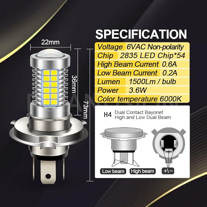 Ruiandsion H4 LEDオートバイヘッドライト電球 DC 6V Hi/Lo切替 2835 54SMDチップセットLED電球 バイクヘッドランプ用プロジェクターレンズ付き、無極性