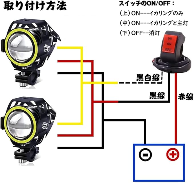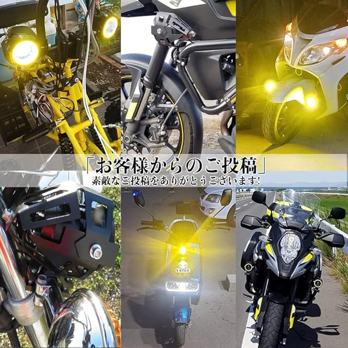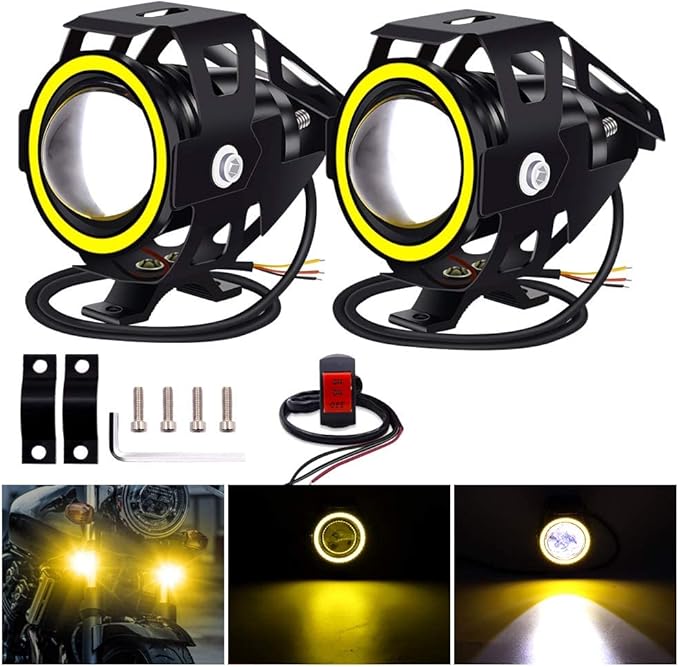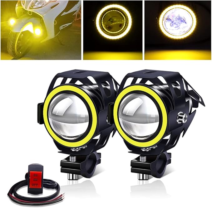 X-STYLE U7 バイクフォグランプ LED 2つモード 白+黄色いイカリング ヘッドライト 補助灯 砲弾型 12V 汎用 スイッチ付き 2個セット(ホワイト+イエロー)