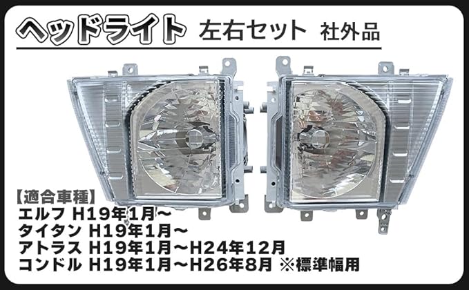いすゞ エルフ マツダタイタン 日産アトラス UDコンドル 用 ヘッドライト 左右セット 社外品になります。 適合車種:エルフ H19年1月~ / タイタン H19年1月~ / アトラス H19年1月~H24年12月 / コンドル H19年1月~H26年8月 ※標準幅用