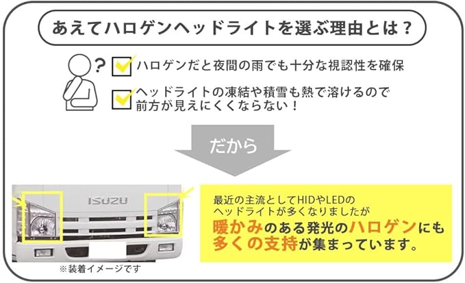 最近の主流としてHIDやLEDのヘッドライトが多くなりましたが、暖かみのある発光のハロゲンにも多くの支持が集まっています。夜間走行時雨天に遭遇した場合、HIDやLEDだと路面に光を反射させてしまい前が見づらくなる現象が起こります。ハロゲンだと夜間の雨でも十分な視認性を確保できますので、こちらを選ばれる方も多数います。