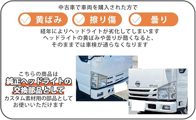 ヘッドライトの黄ばみや曇りが酷くなると、そのままでは車検が通らなくなります。高額な純正部品を用意して交換される方が多いと思いますが、純正互換品のリーズナブルな社外品でコストを抑える事が可能です。こちらの商品は純正ヘッドライトの交換部品として、カスタム素材用の部品としてお使いいただけます。