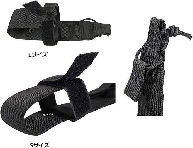 デザイン:背面にモールストラップ付きで、モール対応したバックパック、ベルト、ベストに取り付ける可能で、持ち運びには手軽です。マジックテープ式のベルトがサイズに合わせて調整可能です、いろんな直径のペットボトルや水筒が対応できます。上端のゴムバンドは自由に結束でき、安定感があります。