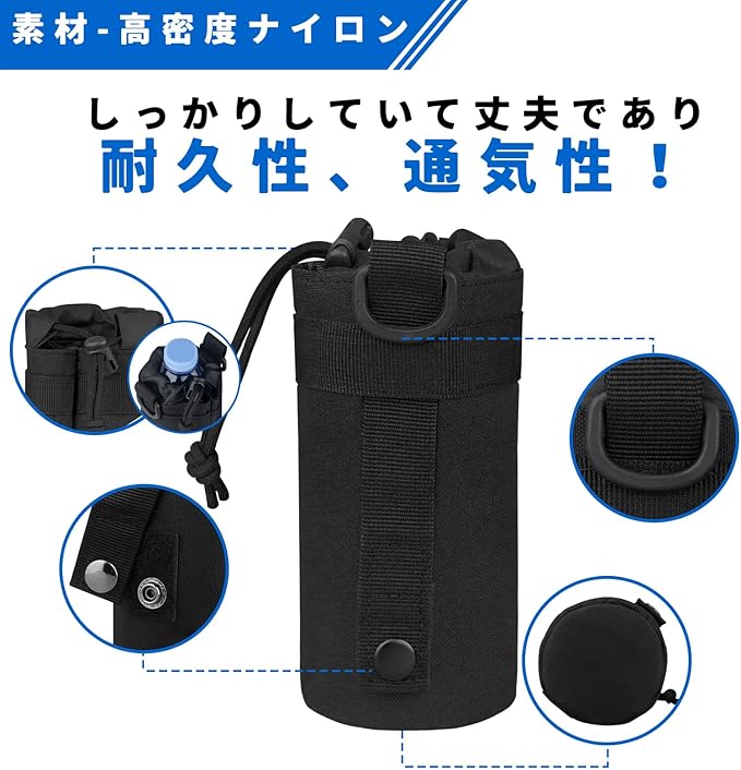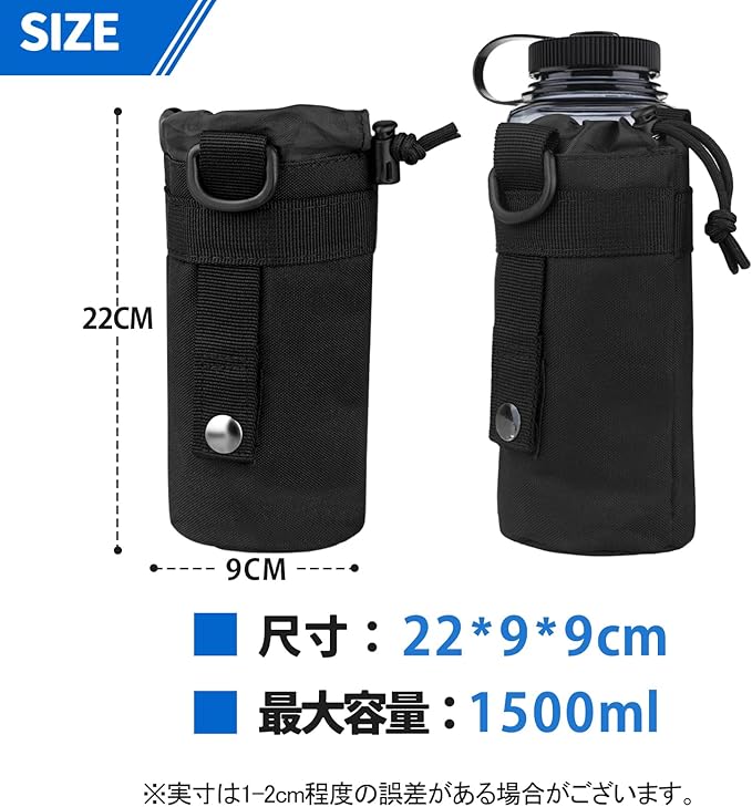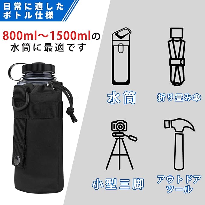 【適合容量規格】:800-1500CMミリリットル。水筒カバー ホルダーの材質:600 D TPU。製品サイズ:幅7.5CM、高さ18CM。(※実寸は1-2cm程度の誤差がある場合がございます。) 容量:最大1500l。モール適用の1000ML水筒カバー,水筒や1000MLのペットボトルをすっかりと収納します
