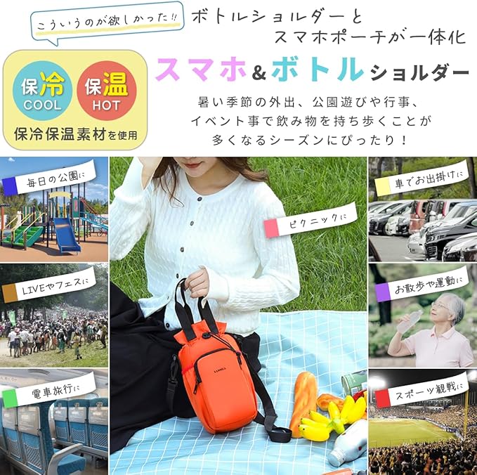 [mitt rom] スマホショルダー ボトルホルダー 保冷 保温 水筒カバー 軽量 撥水 斜めがけ 小さめ 子供 キッズ 大人 通園 公園 遠足 フェス 500ml~1000ml対応