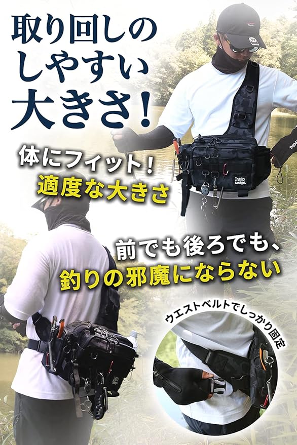 【用途】釣り専用のフィッシングバッグ、ワンショルダーバッグ、ショルダーバッグ、ウエストバッグ、タックルバッグとして。小さめでも大容量なのでおかっぱり、サーフフィッシィング、渓流釣り等のランガンスタイルにも最適です。ベルト調節も可能なのでメンズ、レディース、男女問わずお使い頂けます。