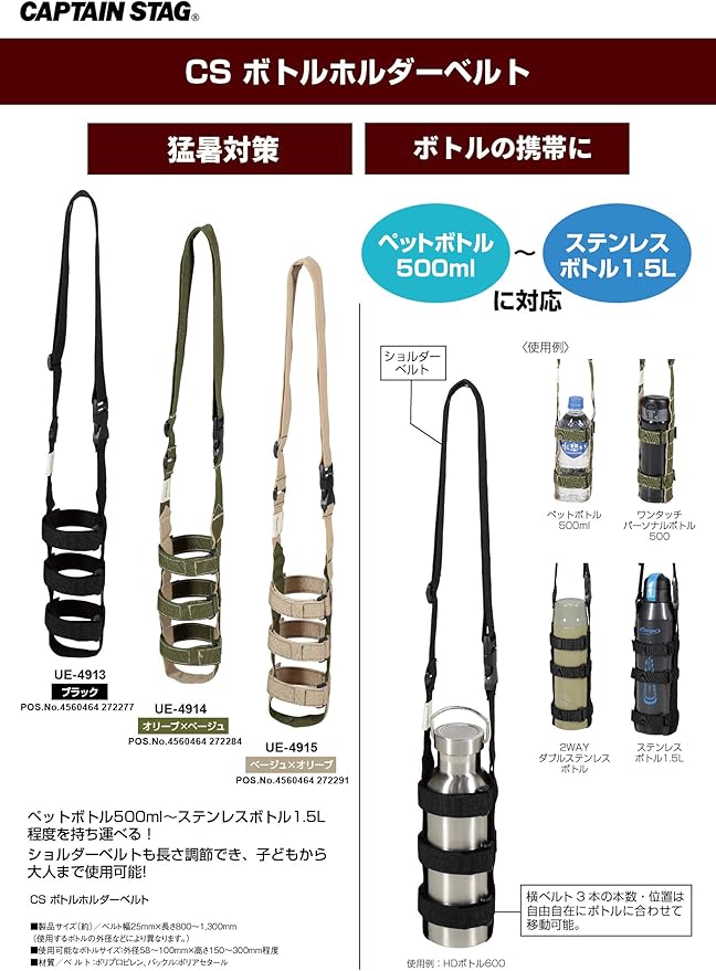 対応:ペットボトル500ml~ステンレスボトル1.5L程度、付属品:ショルダーベルト(長さ調節可能)