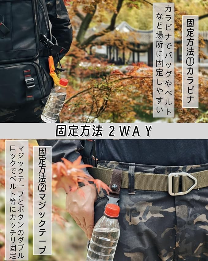 【プロの二種固定方法】**固定方法はプロの2WAYあります。 ▼カラビナクリップ:バッグ/ギアベルトへの瞬時アタッチ。 ▼強化型マジックテープ+ボタンロック:激しい動きでもゼロシェイク。サバゲー/岩登りなど過酷な環境下でもボトルを確実ホールドします。